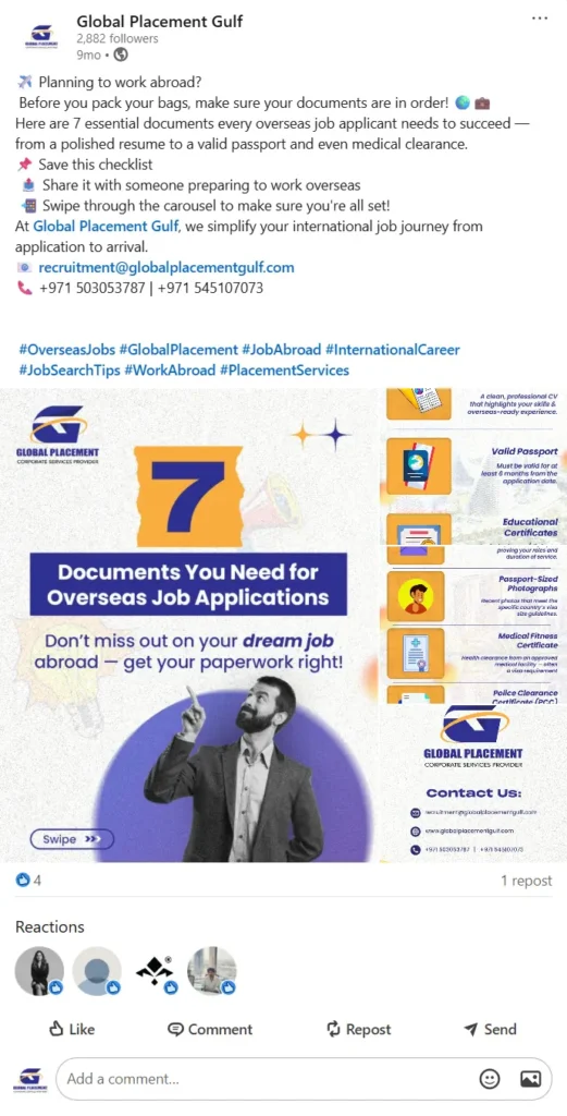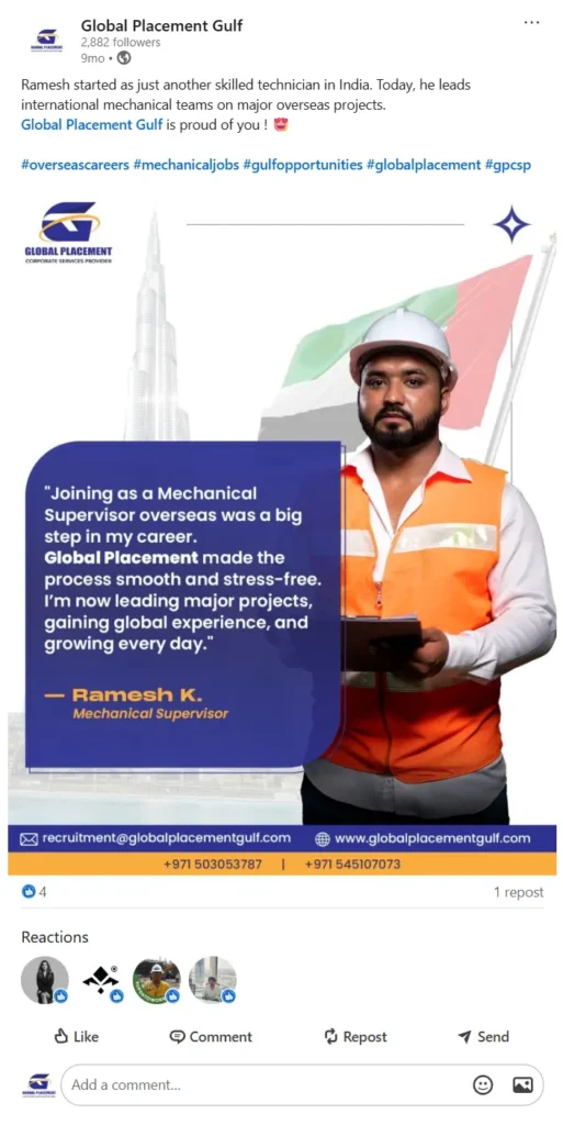 We specialize in overseas recruitment across industries such as Healthcare, Engineering, Hospitality, Construction, Oil & Gas, Manufacturing, Facility Management, Marine, and other specialized sectors. With a strong network of employers across the Middle East, Europe, and South-east Asia, we help organizations access qualified talent while enabling professionals to advance their careers internationally.